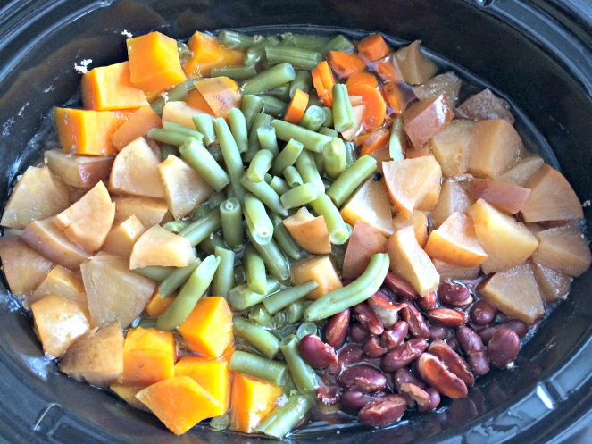 1. Place the meat in the crock pot, add some water so it just covers the chicken. Then add the sweet potatoes, carrots, kidney beans, green beans, and apple.